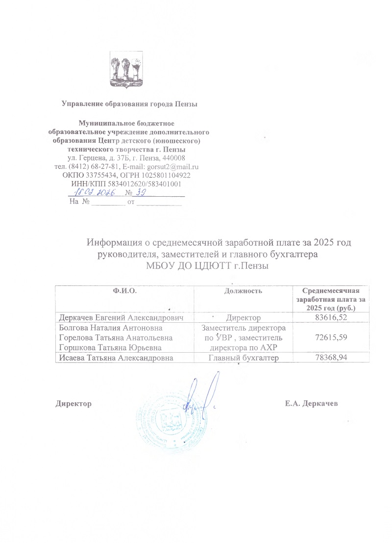 Информация о рассчитанной за 2025г. среднемесячной заработной платы руководящего состава МБОУ ДО ЦДЮТТ г.Пензы