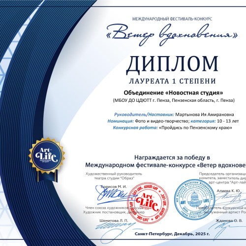 В декабре ребята из объединения «Новостная студия» (пдо Мартынова И.А.) приняли участие в Международном фестивале-конкурсе «Ветер вдохновения».