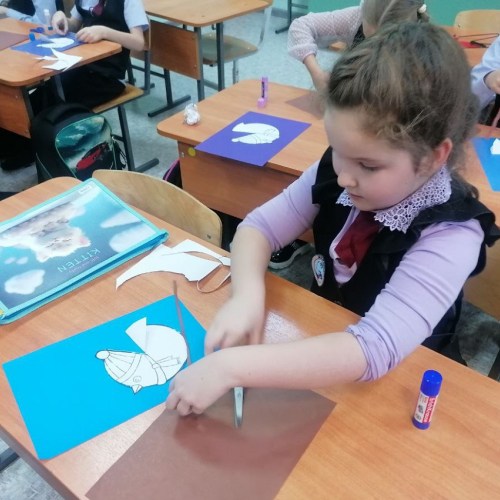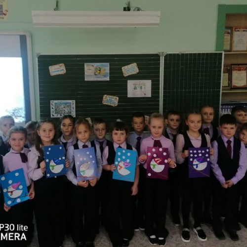 Первоклассники сделали красочные аппликации «Первый снег» с яркими птичками в шапочках и шарфиках.
