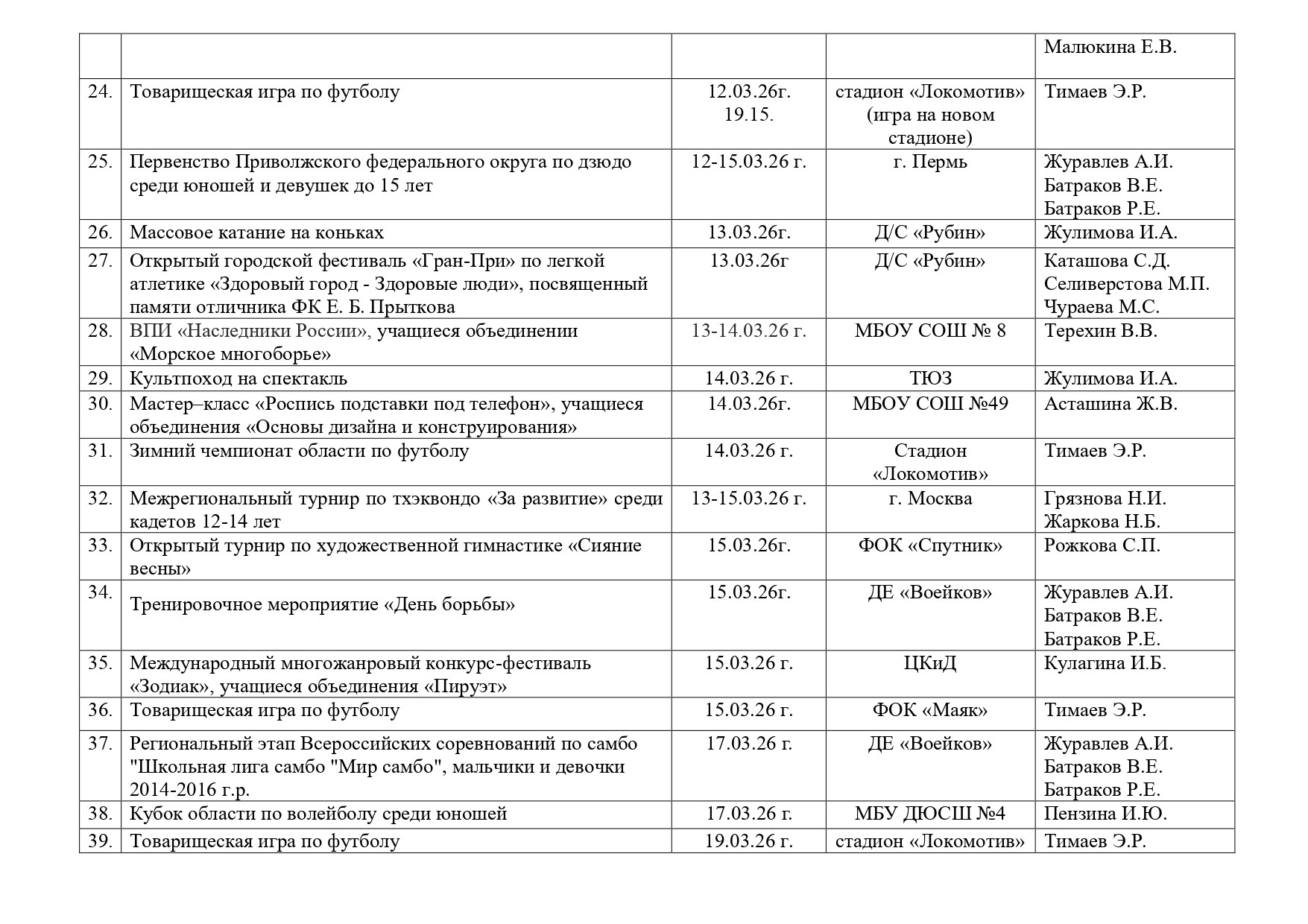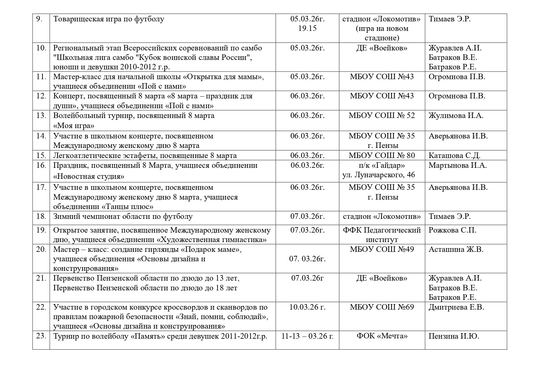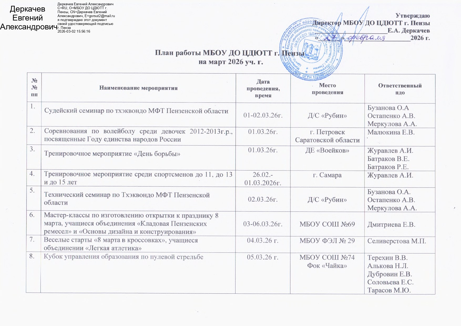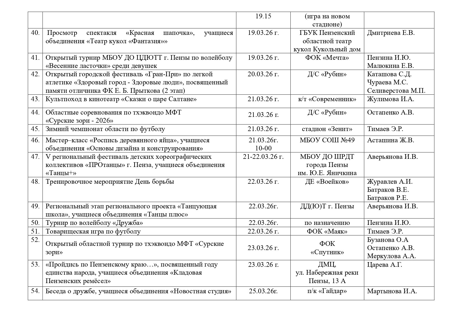 Педагогическая деятельность педагогов МБОУ ДО ЦДЮТТ г. Пензы осуществляется в соответствии с План спортивно-массовой работы МБОУ ДО ЦДЮТТ г. Пензы на март 2026г.