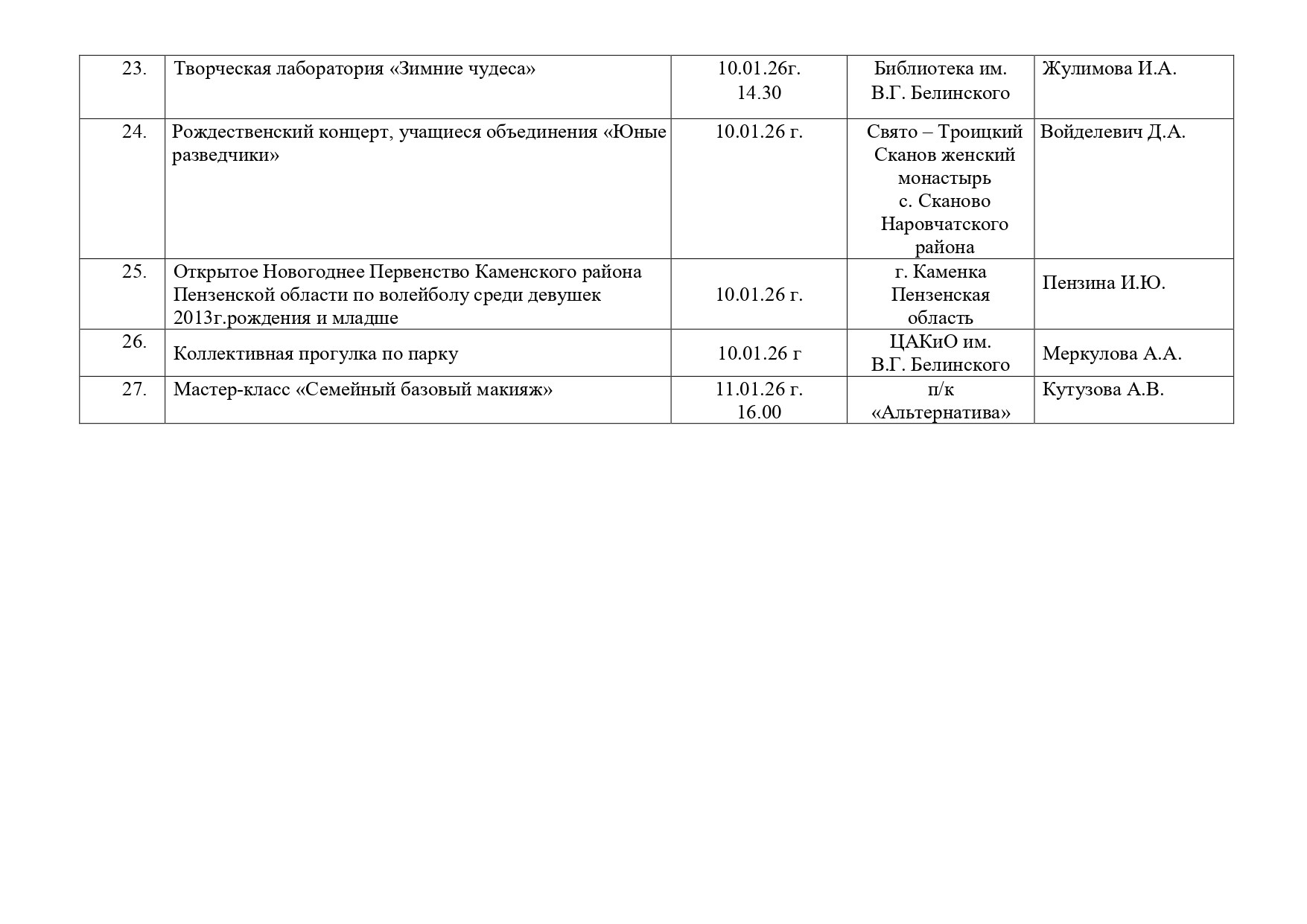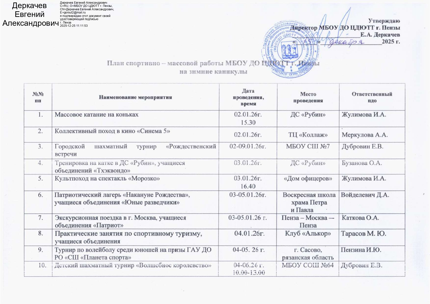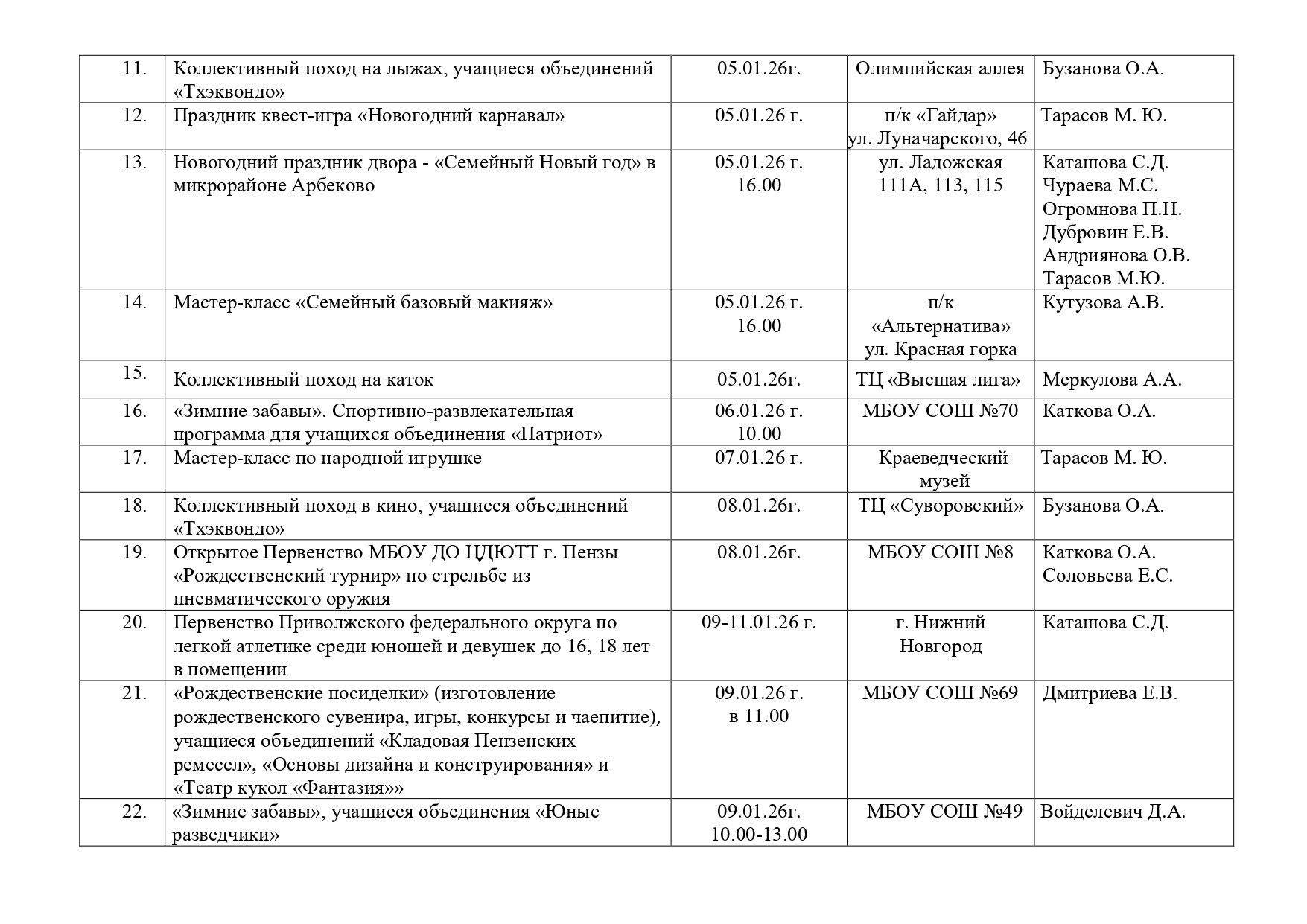 План работы на зимние каникулы МБОУ ДО ЦДЮТТ г. Пензы