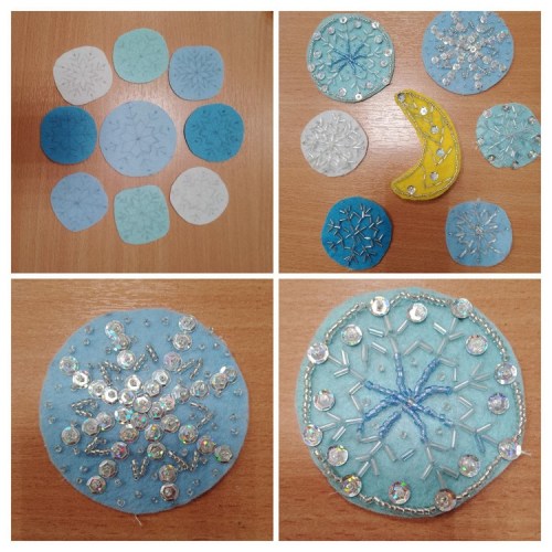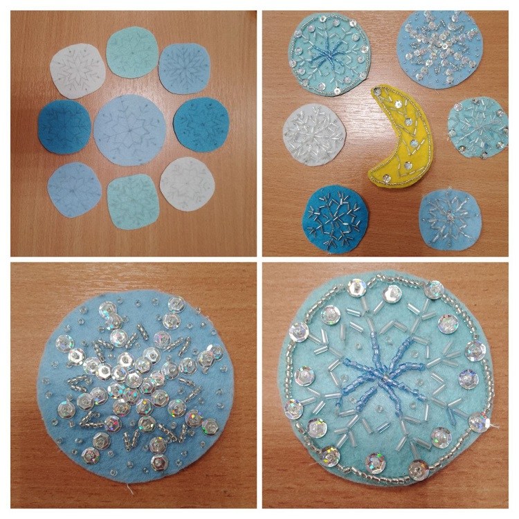 Учащиеся на занятии использовали метод ассоциативно-образного мышления, за основу взяты образы: снежинка, перо и луна. Вышивали юные мастера бисером, стеклярусом, бусинами и пайетками. Мероприятие прошло на базе МБОУ ЛАД 3.