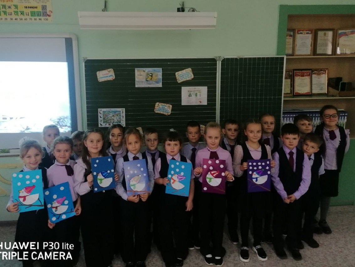 Первоклассники сделали красочные аппликации «Первый снег» с яркими птичками в шапочках и шарфиках.